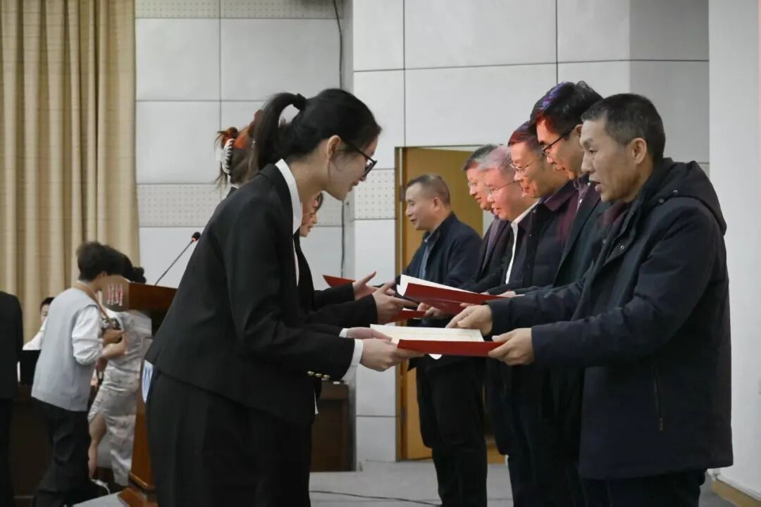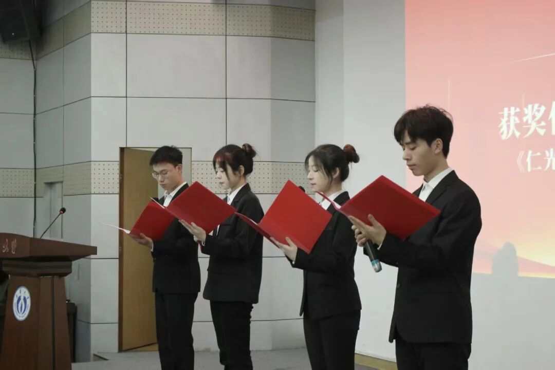 随后,旷勇宣读第五届普仁奖学金表彰决定。陈列尊、彭文胜、李先国、旷勇等领导嘉宾为12名获奖学生分批颁发荣誉证书。颁奖结束,获奖学生代表带来诗朗诵《仁光引路・逐梦韶华》。