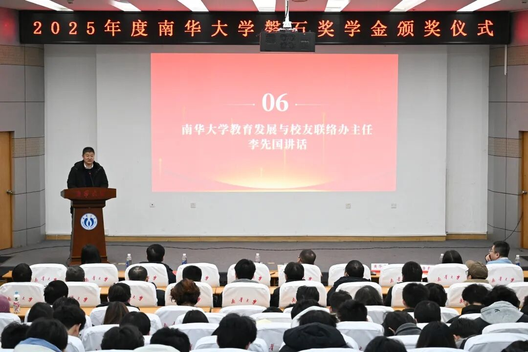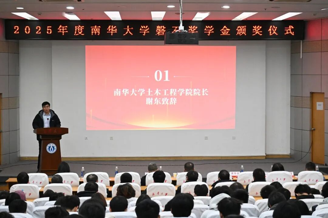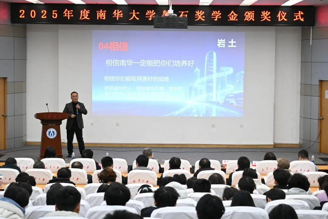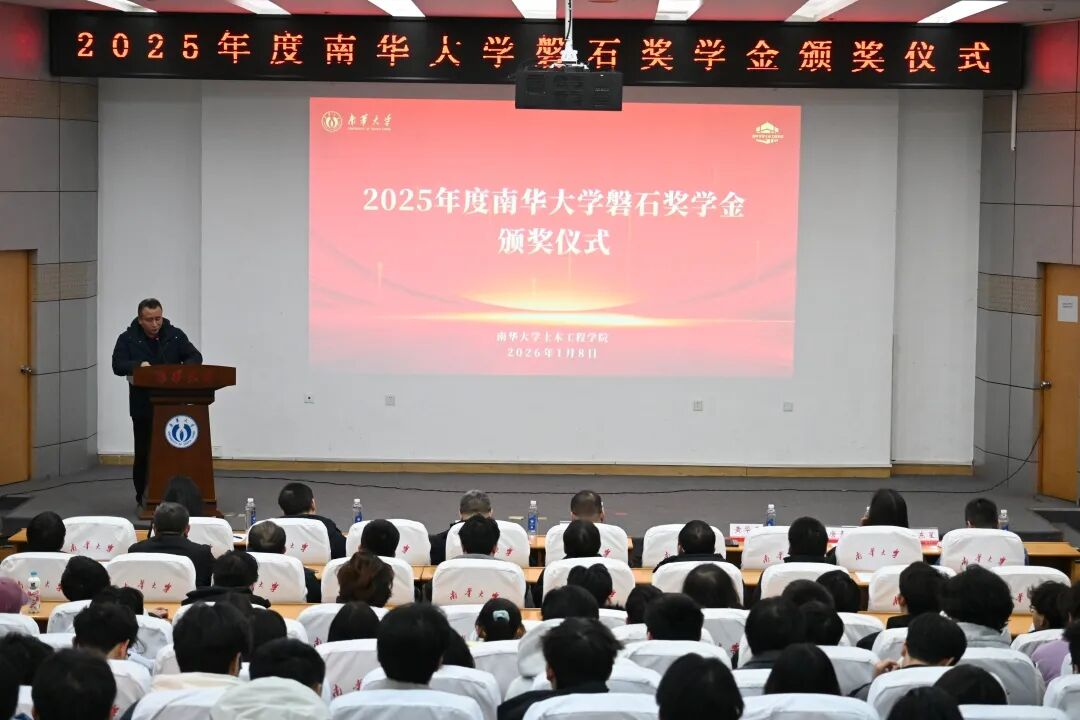 2026年1月8日,学校2025年度磐石奖学金颁奖仪式在红湘校区图书馆报告厅举行。土木工程学院01级岩土工程专业校友、磐石奖学金牵头人张海涛,学校教育发展与校友联络办主任李先国,土木工程学院党委书记黄华勇、院长谢东、党委副书记唐素芝、副院长王东星、孙冰等出席活动,学院部分教师、辅导员、学生代表等百余人共同参加典礼。仪式由黄华勇主持。